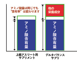 もちろんそうする事で一般の方々はお求め安い価格で購入できるようにもなるというメリットがあるわけですが、私どものデルタバランスサプリの製造スタンスにおきましては、『プロのアスリートの知識や体づくりを一般の方々へ』というスタンスに立ち、サプリメント自体の内容を重視し、その代わりに装飾や販売促進物などにかかるような費用を抑えることで、ご利用いただくに充分に値しお喜びいただける本当に価値のある商品を提供していきたいと考えております。 その為、プロのアスリートやプロのモデルさん達の求められるような構成形態で…すなわち“タンパク質主体のサプリメント”ではなく、消化・吸収・活用に勝るアミノ酸材料主体の構成でサプリメントをご用意しております。